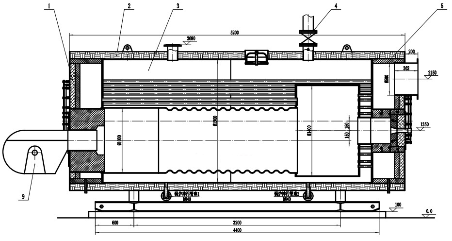 1 前煙箱 2 包裝及保溫(wēn) 3 鍋(guō)爐本體 4 閥門儀表 5 後煙箱 9 燃燒器